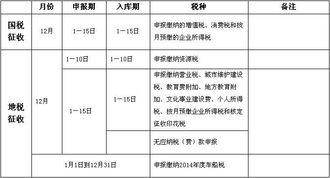 注:具体纳税申报时间以主管税务机关规定为准,此表仅供参考。《中华人民共和国税收征收管理法实施细则》第一百零九条:税收征管法及本细则所规定期限的最后一日是法定休假日的,以休假日期满的次日为期限的最后一日;在期限内有连续3日以上法定休假日的,按休假日天数顺延。