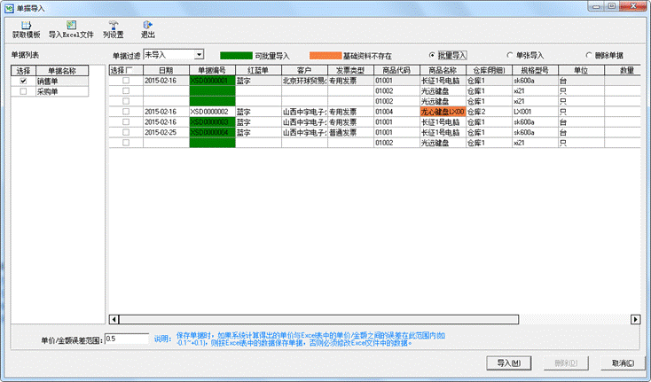 增加单据导入导出功能,可将3e的采购单、销售单导出为Excel文件,也可将其他业务系统导出的Excel文件基于3e的导入模板进行调整后批量导入3e系统,在不同账套、不同系统之间实现业务数据的高效迁移。