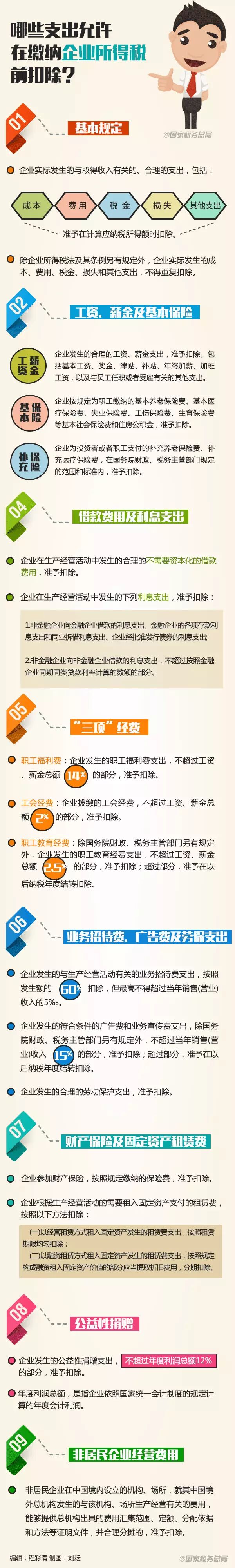 按照企业所得税法的规定,企业实际发生的与取得收入有关的、合理的支出,包括成本、费用、税金、损失和其他支出,准予在计算应纳税所得额时扣除。具体包括哪些支出,一张图告诉你↓